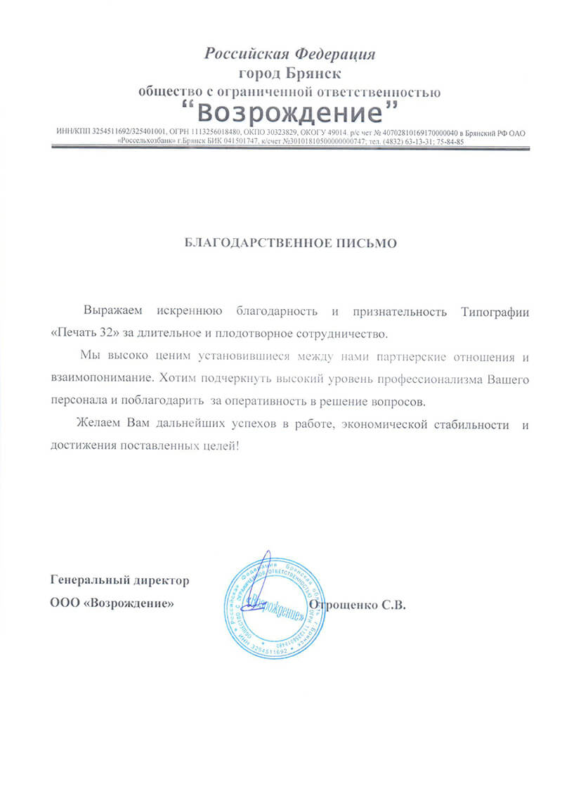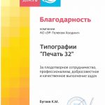Выражаем искреннюю благодарность и признательность компании "Печать32" за длительное и плодотворное сотрудничество. Мы высоко ценим установившиеся между нами партнерские отношения и взаимопонимание. Хотим подчеркнуть высокий уровень профессионализма...